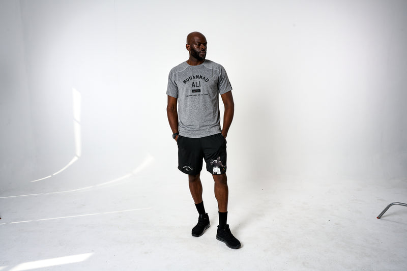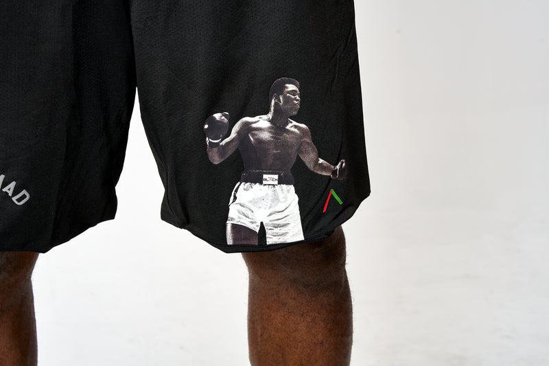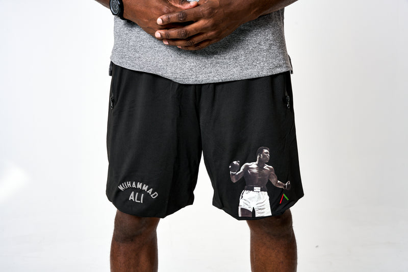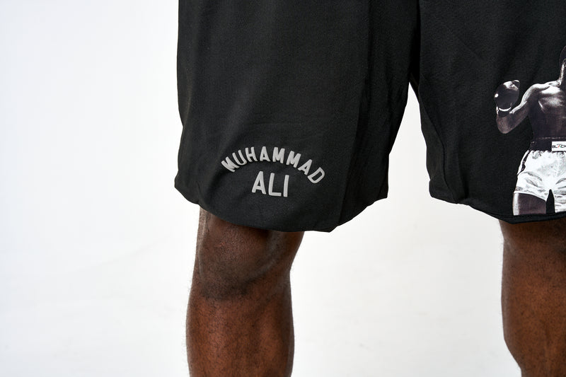 Premium performance shorts with iconic graphic of Muhammad Ali sublimated on the left leg and his classic logo on the right leg.