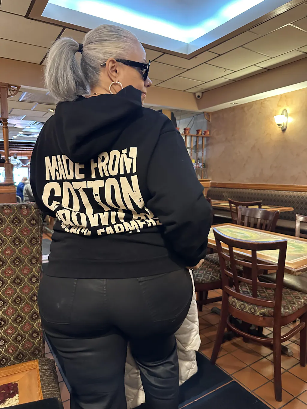 TO REDUCE THE AMOUNT OF WASTE THAT IS GENERATED BY FAST FASHION, BULK INVENTORY ORDERS AND TO EFFICIENTLY USE THE LIMITED COTTON GROWN FROM THESE BLACK FARMERS, PRODUCTS ARE PRINTED, LABELED, AND STITCHED AFTER ORDERING.